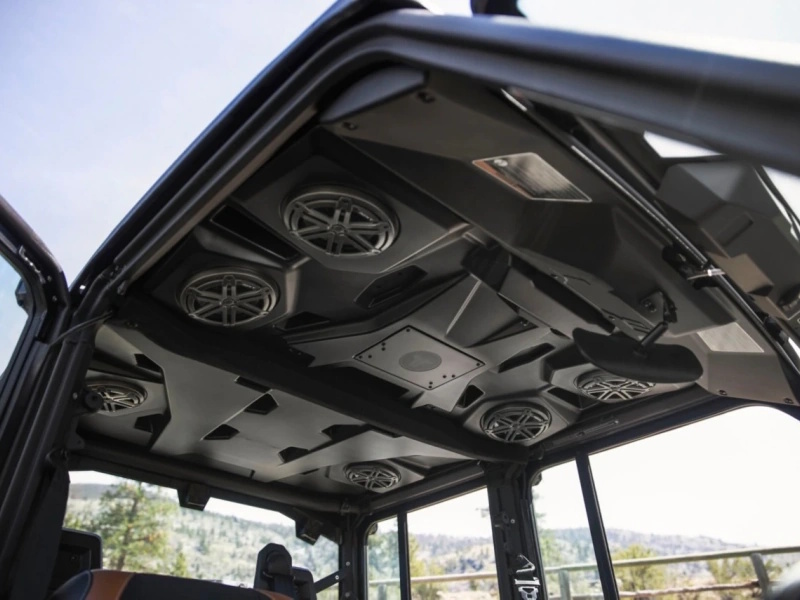 Here's the new waterproof sound system available in option. Six 7.7’’ speakers with Bluetooth compatibility, multi-colored LEDs, an RMC amp and a genuine Rockford Fosgate audio receiver to crank up your playlists when you’re out there in the fields herding or baling to the beat of your own drum. Sounds good? You bet!