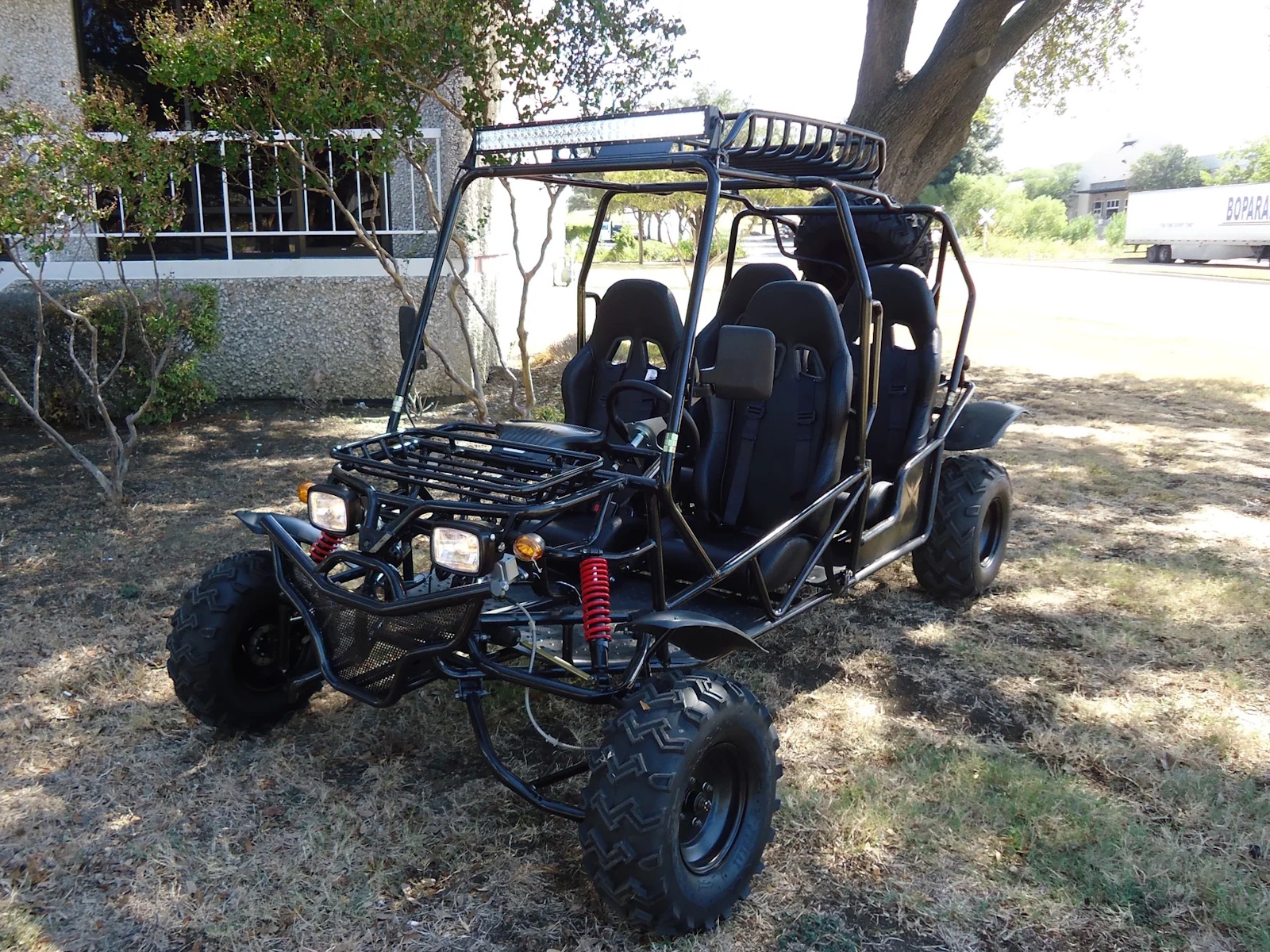 The Hummer 4-Seater Go-Kart features a powerful 200cc engine, durable steel frame, and easy electric start with CVT transmission. Its dual suspension and 21"/22" wheels ensure a smooth ride on any terrain.With free upgrades like top running lights, a spare tire, and knobby tires, it's the perfect choice for off-road fun.