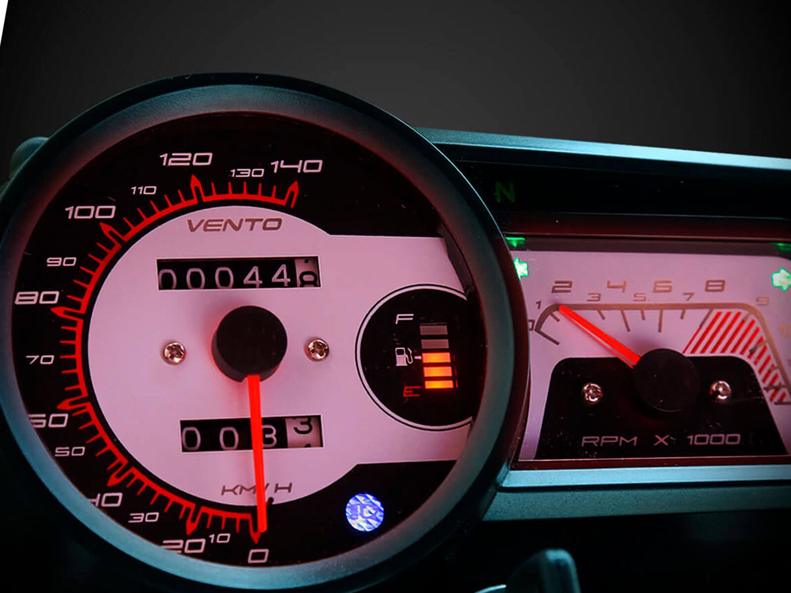 Speedometer, tachometer, fuel gauge and gear indicator.
