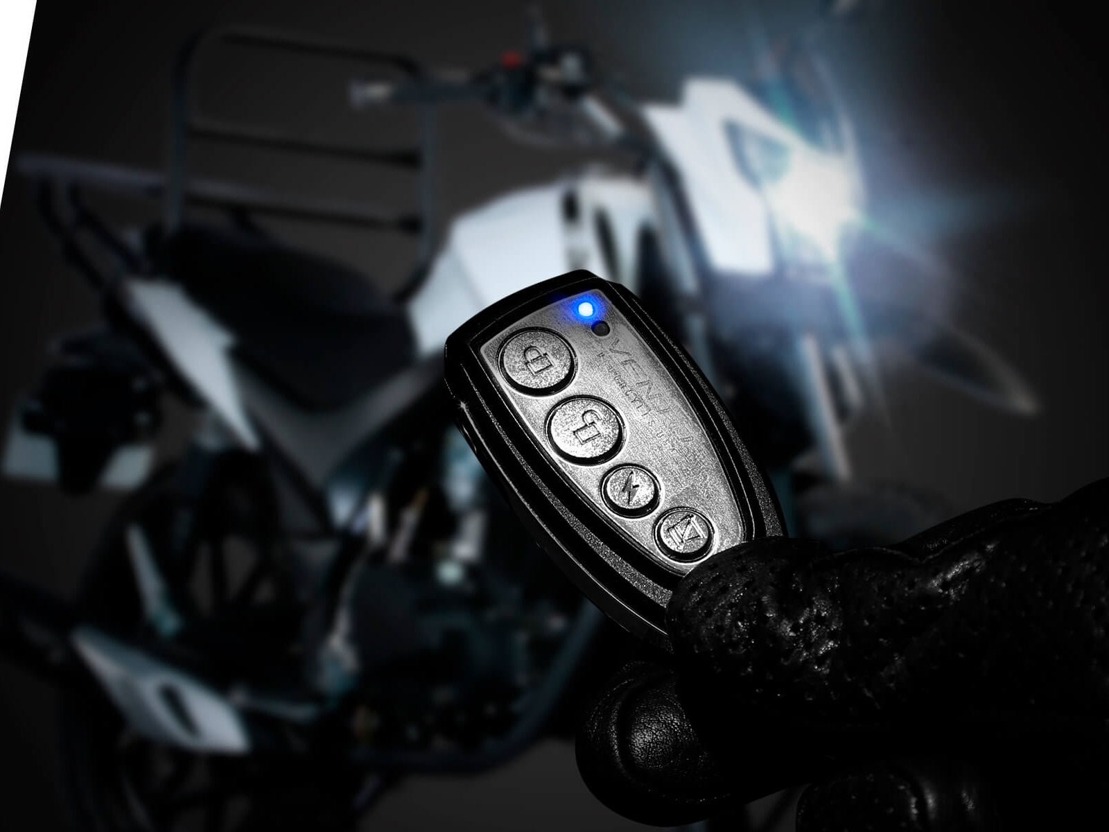 With remote control on and off, motion sensors and panic button.