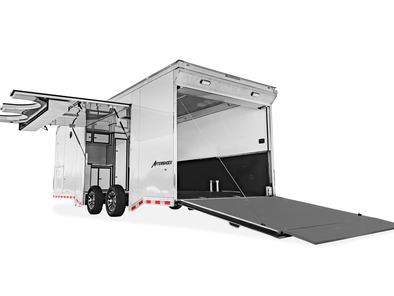 From morning load-up to the final lap, the Aftershock delivers a user-focused experience. The 48" side door and matching step make frequent access simple, while the wide rear ramp—with built-in lights and an extension for low-clearance cars—streamlines loading. Every inch is designed for speed, efficiency, and ease of use at the track.